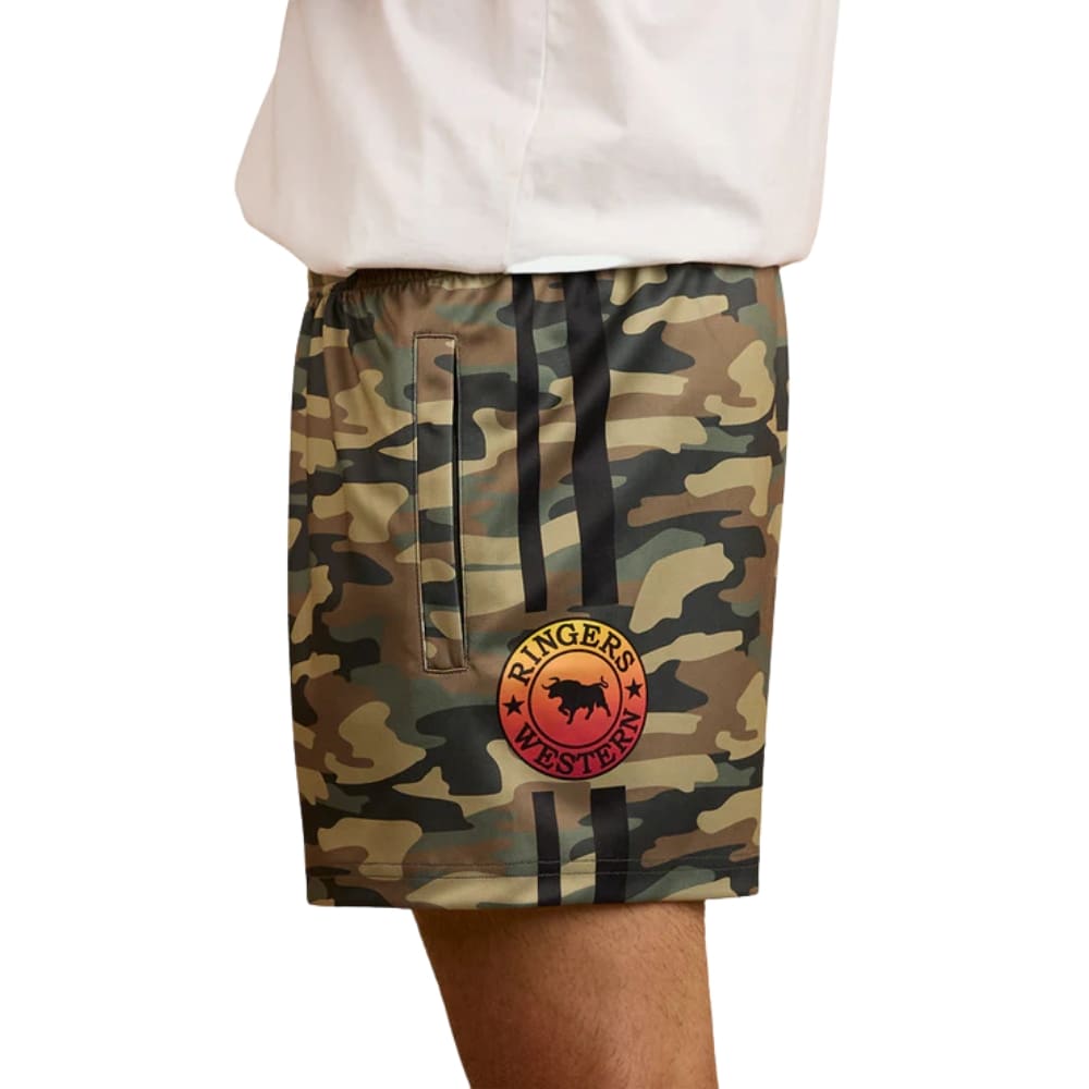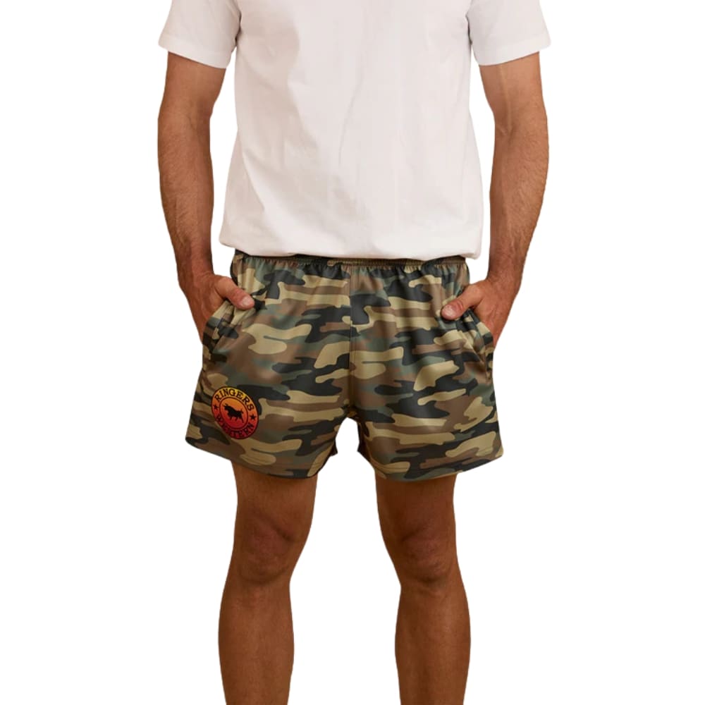 With a sleek camo design and functional features like zippered side welt pockets, these shorts are built for action and style. Finished with Signature Bull logo prints and Ringers Western woven labels, they’re a rugged, reliable addition to your casual or sportswear rotation.