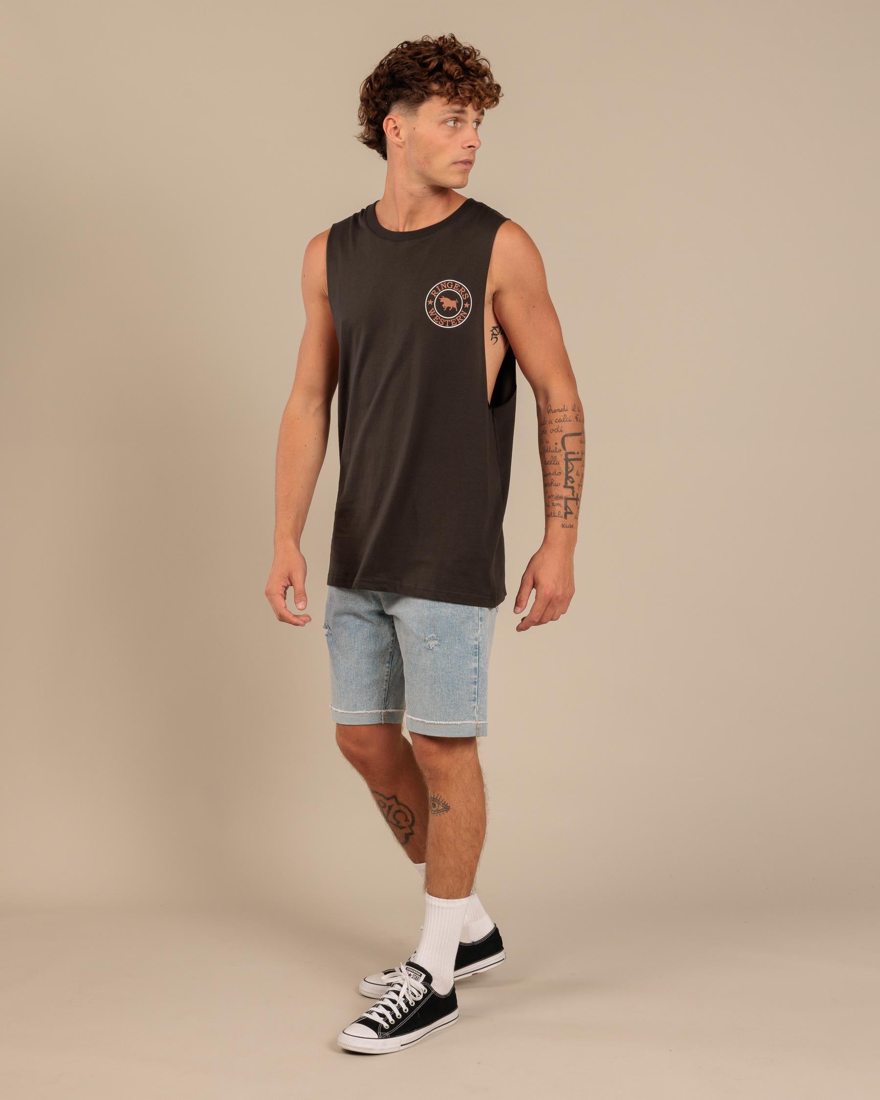 The same Signature Bull print you all know and love on a muscle tank. Designed for those who embrace everything country, this muscle tank combines strength and style in a way that's unmatched. Crafted from premium, soft and breathable fabric, this tank offers durability while keeping you cool under the hot Aussie sun. The raw edge adds a touch of ruggedness, perfect for our cowboys and cowgirls. If you are after comfort, this muscle tank definitely has you covered.