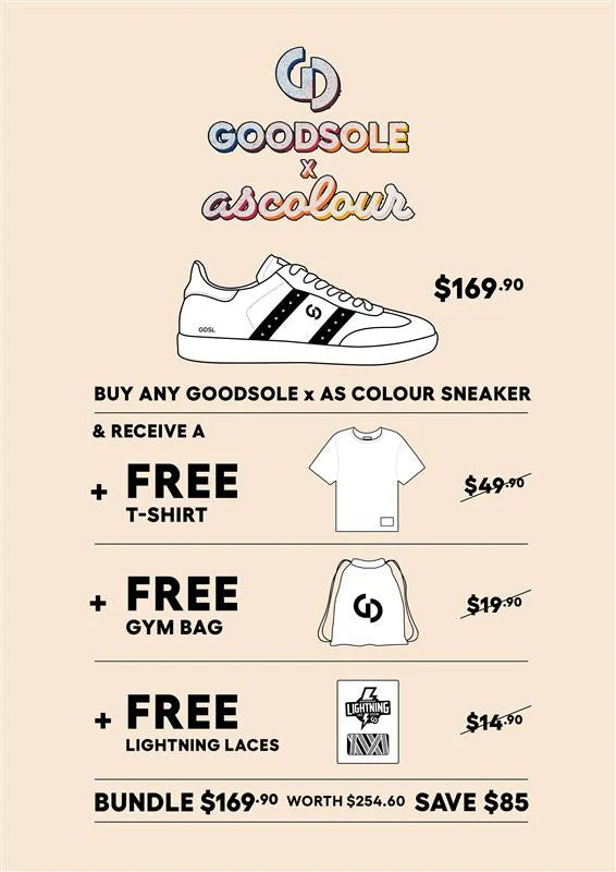 Goodsole have teamed up with the legends at AS Colour to drop a collab that just makes sense. Say hello to their latest kicks—crafted in colourways that perfectly match AS Colour’s most popular tees. Yup, we’re talking full tonal drip. Each sneaker comes with a matching Gym bag and matching lightning laces.