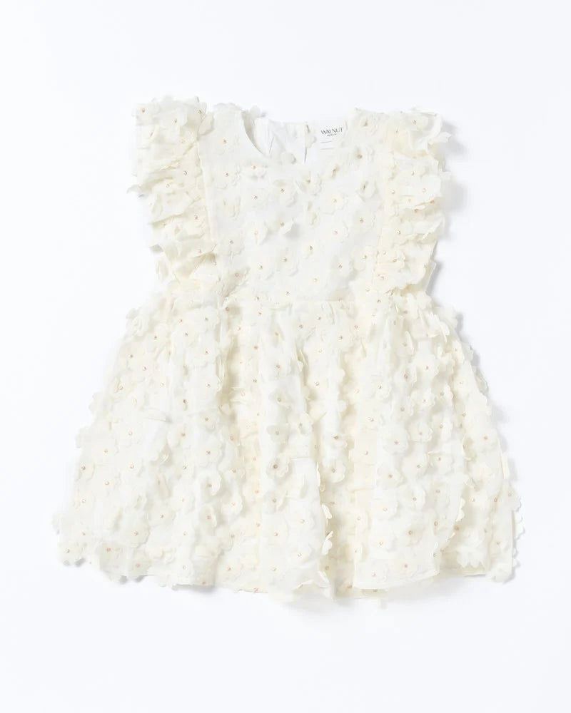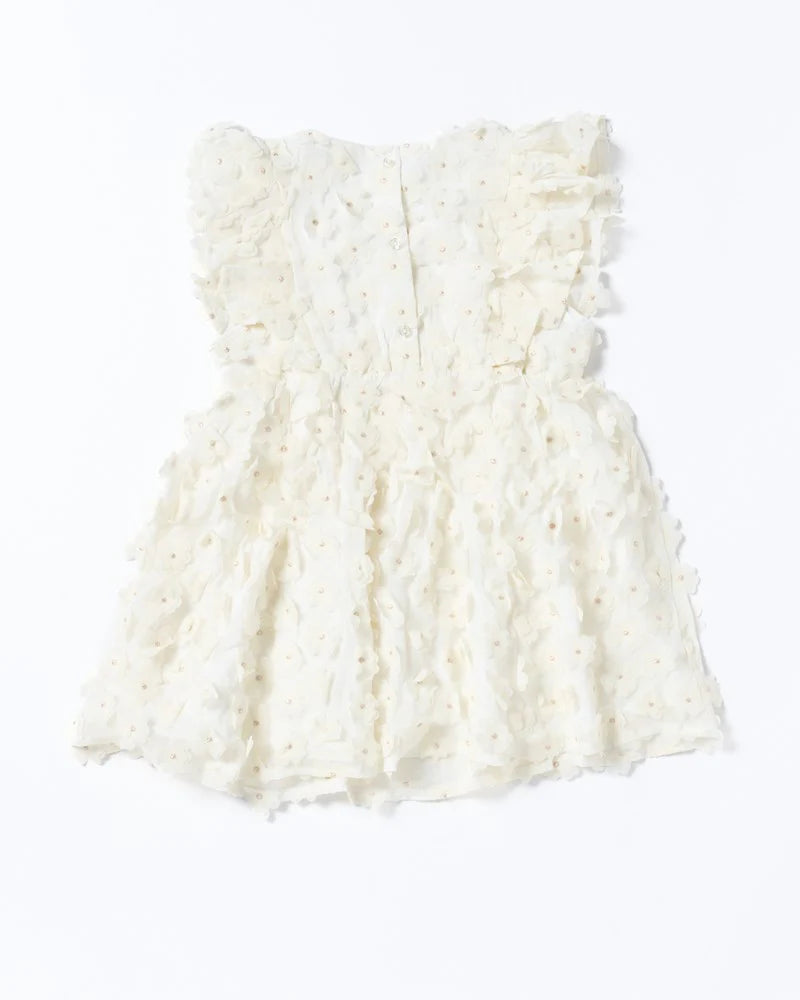 Delight the little ones with the Whimsy Dress in White Tulle, where every twirl feels like a fairy tale. Soft layered tulle adorned with charming 3D floral appliqués and delicate pearl-like centers makes this dress perfect for birthdays, flower girl duties, or simply feeling extra special. Frill sleeves and a full gathered skirt add a playful touch, ensuring dreamy days and magical moments.