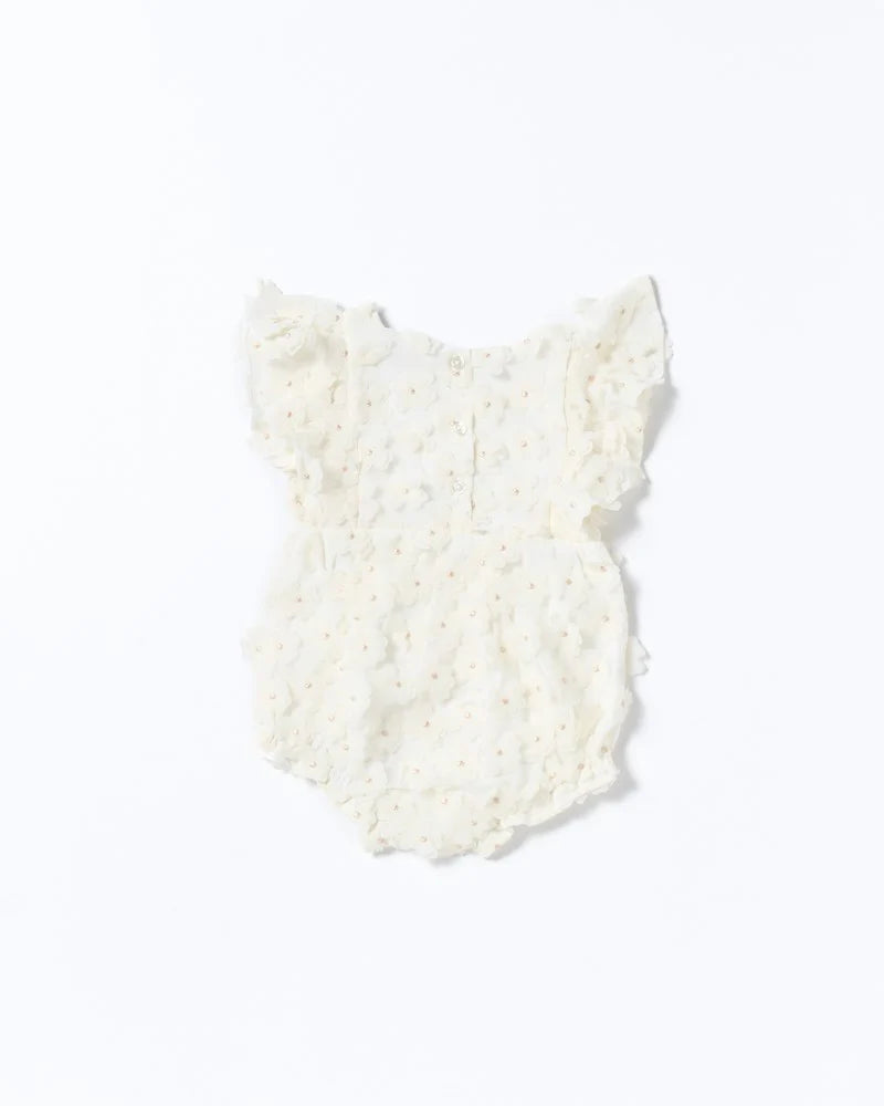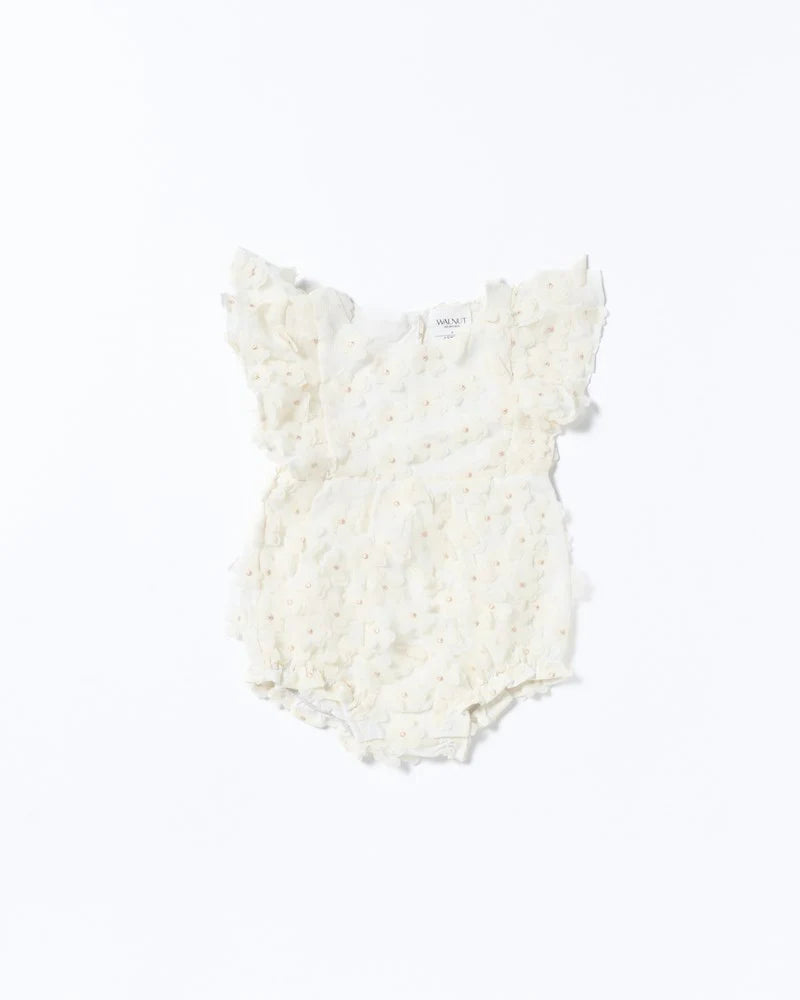 A sprinkle of enchantment for your little star! The Whimsy Romper in White Tulle dazzles with dainty 3D flowers and pearl accents, made from soft layered tulle lined with cozy cotton. With fluttery frill sleeves and stretchy leg openings, it keeps comfort and charm perfectly balanced for those unforgettable moments.